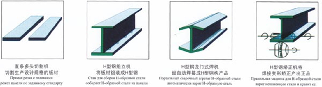 輕型H型鋼的生產工藝過程為: 直條切割——型鋼組立——龍門焊接——翼緣板矯正——小件制作及筋板焊接——〔三維鉆孔——拋丸除銹——噴漆涂裝〕。