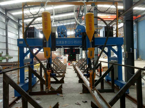 一、用途: LMH4000門型自動埋弧焊機是專門為焊接H型鋼生產設計制造的一種專用設備。我公司生產的鋼結構龍門焊可以雙向來回焊接。在更換上配套使用的箱型梁導弧架后可以順利的進行箱型梁焊接。 二、技術參數 1、適用H型鋼尺寸 寬 度: 200-800㎜ 高 度: 200-1500㎜ 2、焊 接 速 度: 250-2500㎜/min。 3、焊縫跟蹤方式: 機械調整自動跟蹤。 4、電 源: 380V/3P/50HZ。 5、回 車 速 度: 3000㎜/min。 6、焊接 電焊機: ZD-1250 7、焊 絲 直 經: 3.2-5㎜。 8、軌 道 寬 度: 4000㎜。 9、調 速 方 式: 變頻無級調速。 10、驅動: 雙邊驅動 11、升降 柱調節: 上下電動。 12、焊 劑 料 桶: 2×100㎏。 13、軌 道 長 度: 18000㎜*2(客戶自備)。 14、外形 尺寸mm: 長×寬×高(2150×4450×3600) 三、工作原理與結構特性 1、 工作原理 本機工作原理同焊機工作原理,是利用電弧能量將焊接母材熔化,同時填充材料也熔化,使填充材料與母材結合在一起的工作機器。 2、 結構特性 本機主要由電焊機、門架、回收裝置、導向裝置、電控系統組成。 A、 電焊機配置國產成都焊研ZD-1250焊機。 B、 門架采用型材焊接而成。 C、 回收裝置主要用于焊劑的自動覆蓋和自動回收循環系統。 D、 導向裝置在焊接過程中可以跟蹤焊縫,具有上下左右自動補償功能。 E、 電控部分主要包括有按鈕、接觸器、保險絲、變頻器、數顯表等一系列電器元件。 四、安裝調試 本機主機在工廠內已經做好調試工作,為保證質量必須進行下列工作: 1、 開箱后對機器進行清洗去污工作。 2、 調整好軌道水平度和兩軌道平行度。 3、 整機吊裝在軌道平面上。 4、 掛好電纜線,接通電源。 5、 檢查各電路是否接通或短路。 五、操作規程 1、焊前檢查 A、軌道上是否有異物阻擋及整潔。 B、焊粉量及流量是否足夠及通暢。 C、電源及保險絲是否完好正常,MZ-1250主機應處于焊接條件位置。 D、焊口清除:焊口易附著水氣、灰塵、油脂、焊渣及涂料、這些都是焊道廢氣的來源。使得焊接后,焊道產生脆化及氣孔,因此必須清除干凈。 E、開車檢測焊絲焊粉是否通暢,電纜臺車是否有松動現象及其軌道是否有障礙物, 接地線及焊接電纜是否真的接緊,是否有燒毀現象。 F、焊絲盤是否運轉通暢。 2、加入藥劑 A、 在斷電情況下,打開初級分離器將藥劑裝入(約50㎏),裝好初級分離器。 B、 打開料斗手閥,使小藥斗內充滿焊劑。 C、 在焊接過程中將漏斗打開,啟動回收裝置連續放料,回收工作進行。 D、 每班應攪拌回收裝置粉塵袋,清除雜物,檢查焊劑量,如有必要加入藥劑則加入一定量藥劑,同時檢查一次氣密性。 3、焊接操作 A、 先后接通總電源、門架驅動電源及焊接電源。 B、 將伸縮柱升起。 C、 門型架移到起焊位置,調整伸縮柱之高度,使機頭置于焊件口邊緣。 D、 配合焊口形狀調整高度,按下焊絲手動開關,將焊絲送出,將焊絲用鐵剪剪去碳化部分,以銳角為宜,利于起弧。 E、 調節NA-3使直流系統的焊絲與工件接觸,調節NA-4使交流系統上的焊絲離工件約10㎜。 F、 將藥劑覆蓋在焊口與焊絲上。 G、 依焊接程序設定焊接速度,焊接電壓電流,將焊接開關打在“自動”位置。 H、 按下行走開關,同時按下NA-3及NA-4或MZ-1-1000的工作開關,實現自動焊接。 I、 焊接完畢后,關掉焊粉回收機,將機臺退回原來起焊處,進行下一次焊接(F、G僅用于林肯焊機)。 4、焊接時注意事項 A、 焊接起弧后,注意焊縫成型后形狀(可適當調節電流、電壓、焊接速度焊絲高度等)。 B、 調節焊劑流量,焊接時目視焊縫,以熔池為“微紅”狀態最佳。 C、 焊絲輸送過程無卡阻現象。 D、 注意焊劑循環情況,不得有堵塞現象。 E、 焊接時注意門架行走平穩性。 六、維護保養 為保證機械使用壽命請按下列保養方法保養: 每日檢查